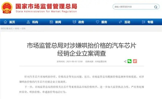8月3日最新消息,国家市场监督管理总局披露称,针对汽车芯片市场哄抬炒作、价格高企等问题,近日,市场监管总局将根据价格监测和举报线索,对涉嫌哄抬价格的汽车芯片经销企业立案调查。