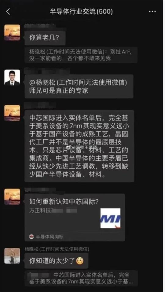 就在上周末,资本市场的一个“大瓜”,让吃瓜群众乐此不疲。方正证券的一位分析师与中芯国际光刻胶负责人杨晓松在微信群里意见相左,在争执的过程中,杨晓松不屑说道,“别扯ArF(光刻胶),没一家能看的,各个都不敢来见我。”,于是,有了对方的霸气回怼。