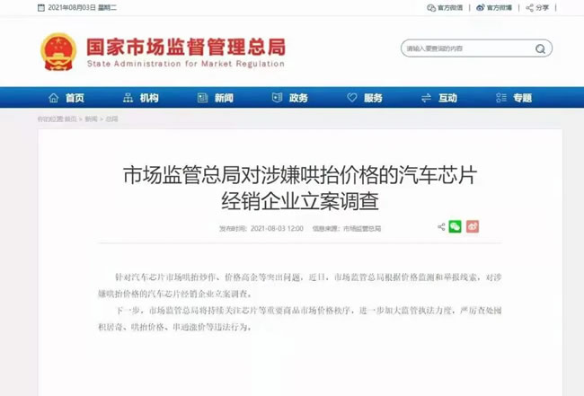 市场监管总局对涉嫌哄抬价格的汽车芯片经销企业立案调查