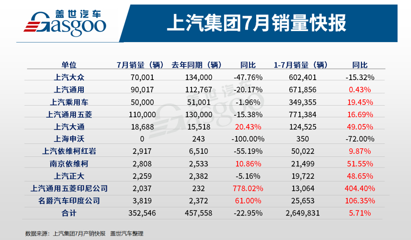 上汽集团7月销量同比下滑23%,两大合资公司持续下挫