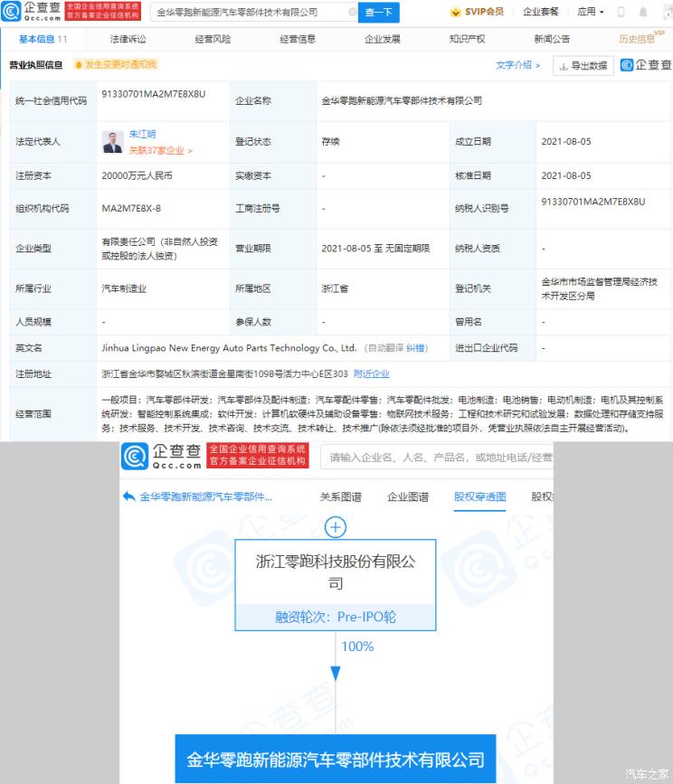日前,我们从互联网获悉,金华零跑新能源汽车零部件技术有限公司成立,该公司由浙江零跑科技股份有限公司100%控股。