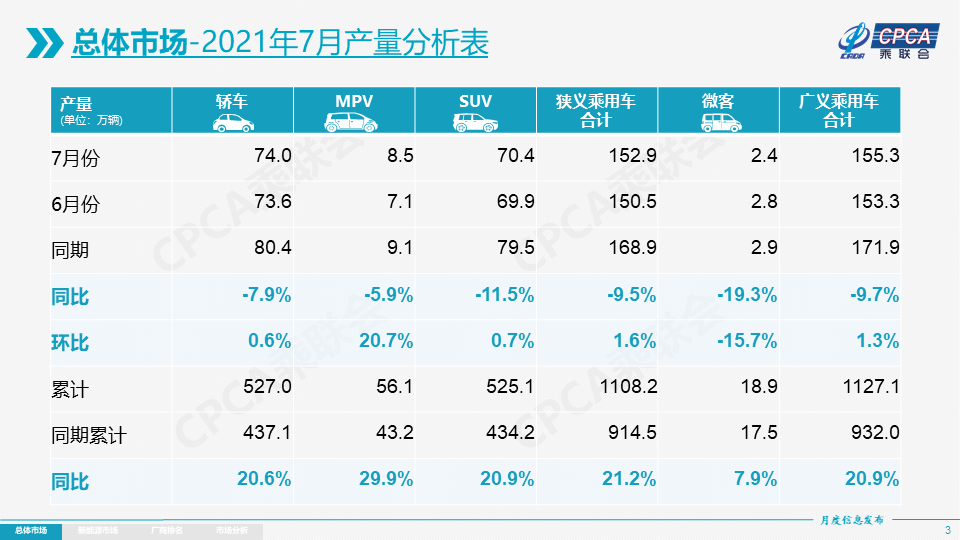 生产:7月乘用车生产152.9万辆,同比2020年7月下降9.5%,其中豪华品牌生产同比下降2%,合资品牌生产下降33%,自主品牌生产增长30%。1-7月累计生产1108.2万辆,同比2020年增长21.2%。近期芯片短缺影响生产节奏,但7月的近30%的车企产量创今年以来的新高,较6月的18%有明显提升,体现出芯片影响逐步改善的趋势。尤其是自主品牌传统车企和新能源车企强化供应链优势,有效化解芯片短缺压力,取得7月的生产环比6月增长的良好表现。