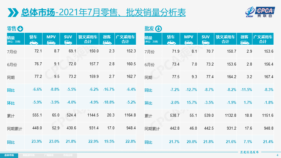批发:7月厂商批发销量150.7万辆,环比下降1.9%,同比下降8.2%,较19年7月下降1%。1-7月累计批发销量1132.8万辆,同比增长21.6%,较2019年同期减少15万辆。