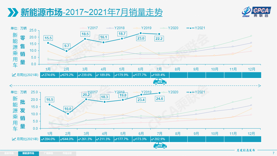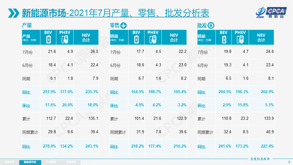 新能源:7月新能源乘用车批发销量达到24.6万辆,环比增长5.1%,同比增长202.9%。1-7月新能源乘用车批发133.9万辆,同比增长227.4%。7月新能源乘用车零售销量达到22.2万辆,同比增长169.4%,环比下降3.2%。1-7月新能源车零售122.9万辆,同比增长210.2%。与传统燃油车走势形成强烈差异化的特征,实现对燃油车市场的替代效应,并拉动车市向新能源化转型的步伐。