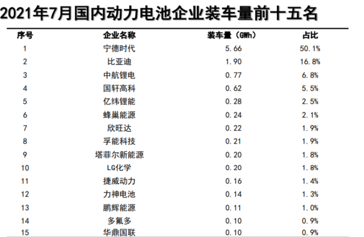 8月11日消息据中国汽车动力电池产业创新联盟的数据显示,7月份国内动力电池企业装车量前5名有:宁德时代(50.1%)、比亚迪(16.8%)、中航锂电(6.8%)、国轩高科(5.5%)、亿纬锂能(2.5%)。