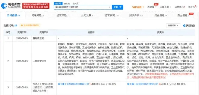 天眼查App显示,8月10日,深圳富桂精密工业有限公司发生多项工商变更,企业注册资本增至32.4亿人民币,增幅超110%;经营范围新增汽车零部件及配件制造等。深圳富桂精密工业有限公司成立于2017年5月,法定代表人为黄国荣,股东信息显示,该公司由富士康工业互联网股份有限公司全资控股。