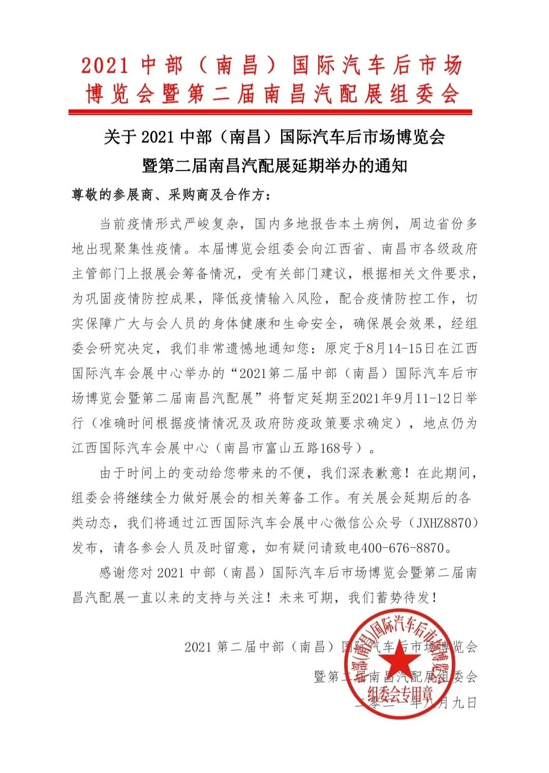 当前疫情形式严峻复杂,国内多地报告本土病例,周边省份多地出现聚集性疫情。本届博览会组委会向江西省、南昌市各级政府主管部门上报展会筹备情况,受有关部门建议,根据相关文件要求,为巩固疫情防控成果,降低疫情输入风险,配合疫情防控工作,切实保障广大与会人员的身体健康和生命安全,确保展会效果,经组委会研究决定,我们非常遗憾地通知您原定于8月14-15日在江西国际汽车会展中心举办的“2021第二届中部(南昌)国际汽车后市场博览会暨第二届南昌汽配展”将暂定延期至2021年9月11-12日举行(准确时间根据疫情情况及政府防疫政策要求确定),地点仍为江西国际汽车会展中心(南昌市富山五路168号)。