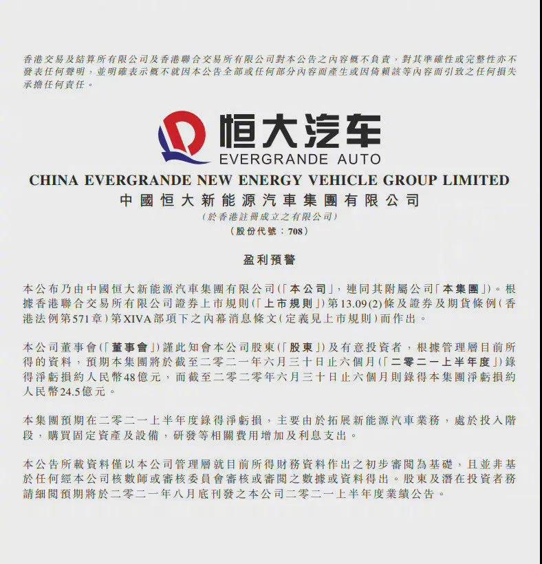 8月9日,恒大汽车发布公告,上半年预计净亏损约人民币48亿元,而2020年同期净亏损约人民币24.5亿元。恒大汽车在公告中表示,上半年亏损主要是因为公司仍处于投入阶段,购买固定资产及设备、技术研发等开支有所增加。