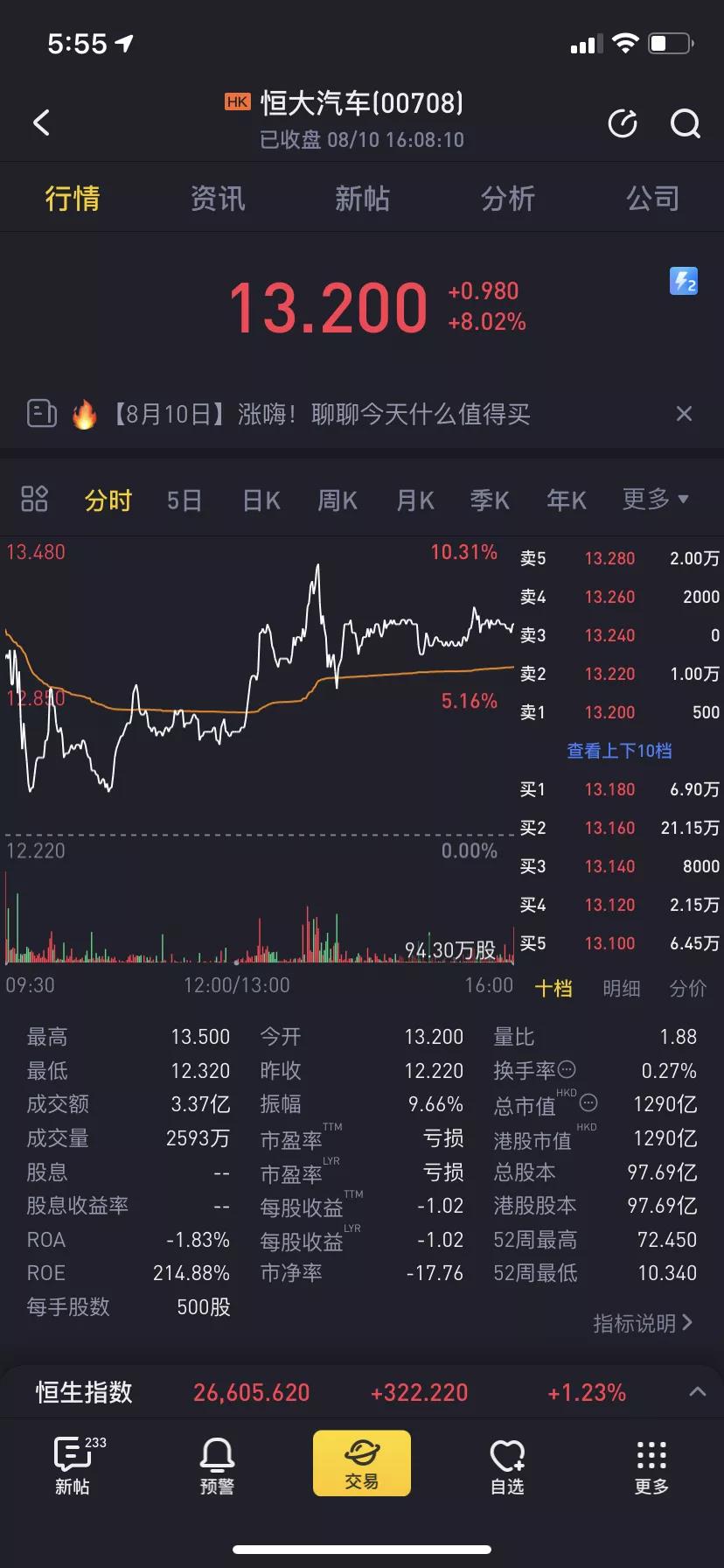 虽然恒大汽车仍处于亏损状态,但是恒大汽车在资本市场的走势还不算差。8月10日,恒大汽车开涨逾8%,盘中一路震荡高走,截止港股收盘,恒大汽车报涨8.02%,报收13.2港元,总市值为1290亿港元。当然,虽然恒大汽车单日股价涨幅较大,但是与今年2月份的高位相比已经大幅缩水。