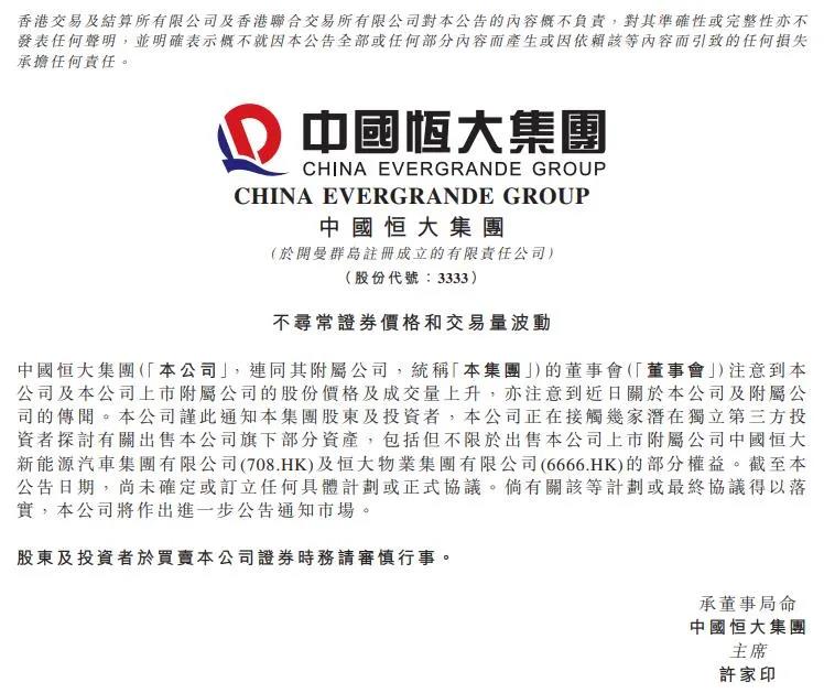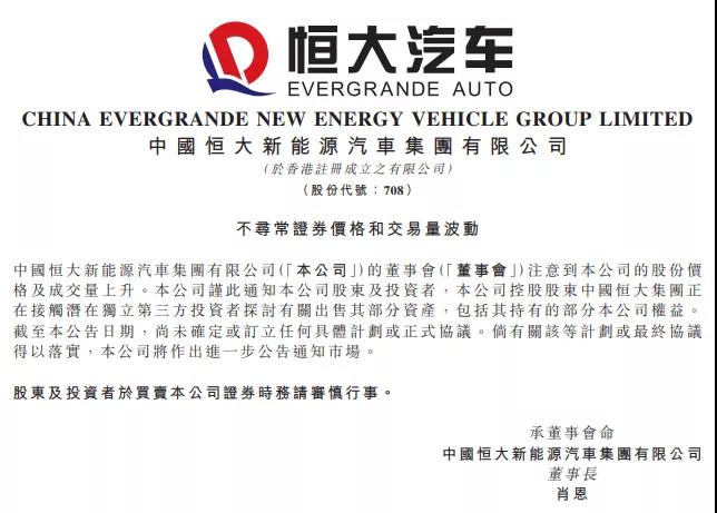 值得注意的是,今日,中国恒大发布公告显示,公司正在接触几家潜在独立第三方投资者探讨有关出售本公司旗下部分资产,包括但不限于出售本公司上市附属公司中国恒大新能源汽车集团有限公司及恒大物业集团有限公司的部分权益。
