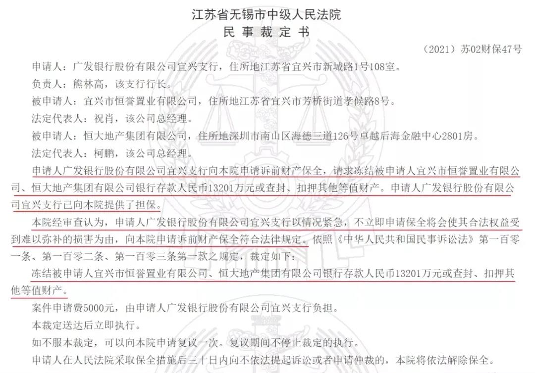 在今年的7月19日,一封民事裁定书在网络曝光,其内容为申请人广发银行宜兴支行向江苏省无锡市中级人民法院申请诉前财产保全,请求冻结被申请人宜兴市恒誉置业有限公司、恒大地产集团有限公司银行存款13201万元或查封、扣押其他等值财产。对于申请原因,广发银行宜兴支行给出的理由是:情况紧急,不立即申请保全将会使其合法权益受到难以弥补的损害。虽然过了不久,事件便以恒大和广发和解而告终。但广发银行的举动也引发了外界对恒大财务状况的担忧,恒大去年至今主要面临的危机基本都是围绕其巨额债务展开。