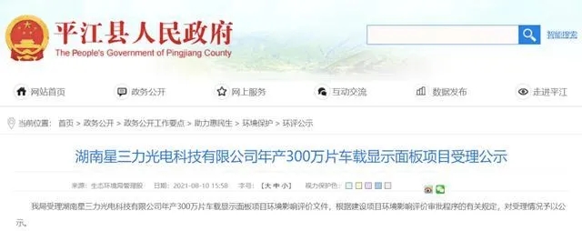 日前,湖南平江县人民政府发布“湖南星三力光电科技有限公司年产300万片车载显示面板项目受理公示”。文件显示,湖南星三力光电科技有限公司年产300万片车载显示面板项目总投资1000万元。