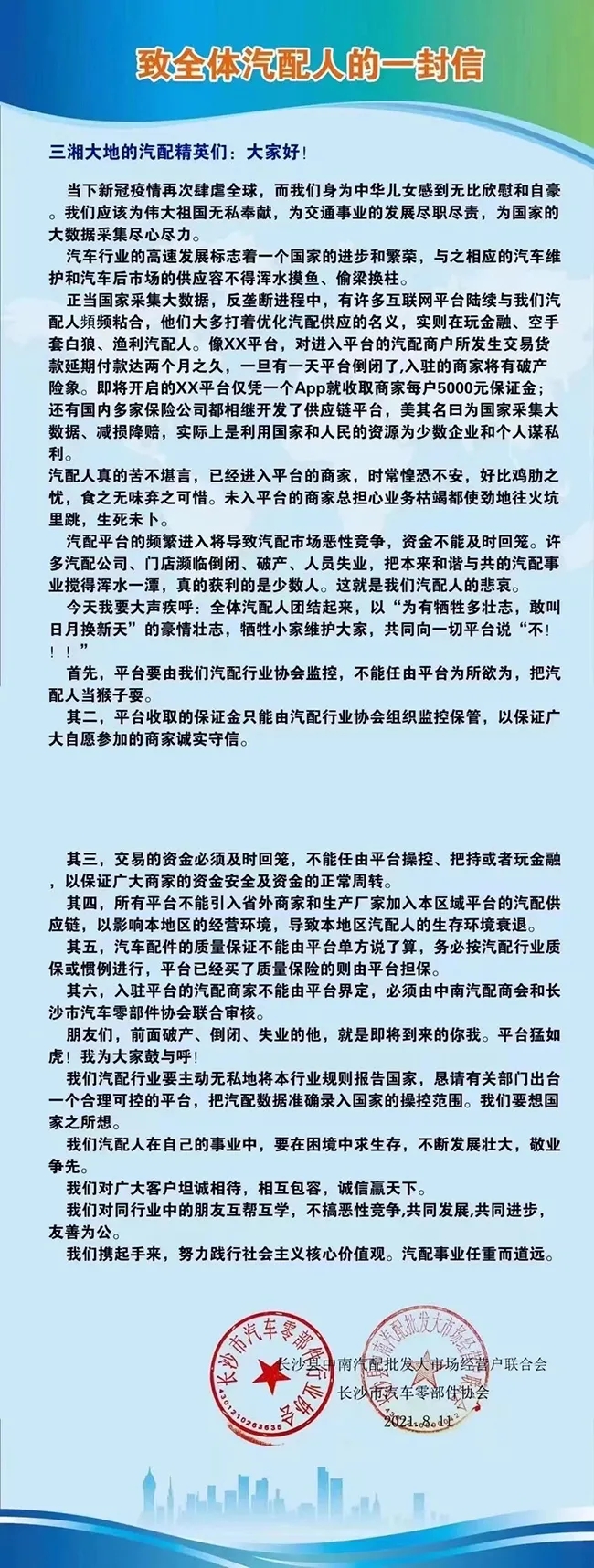 日前,一个名为《致全体汽配人的一封信》的文件在行业当中流传。这封信由长沙市汽车零部件行业协会和长沙县中南汽配批发大市场经营户联合会共同署名,致信对象是“三湘大地的汽配精英们”,可以理解为湖南省的汽配经销商。在这封信当中,首先提到了互联网汽配平台对传统汽配经销商带来的种种负面影响,随后提出了针对汽配平台的六项要求,最后呼吁所有汽配经销商团结一致、携手共进。