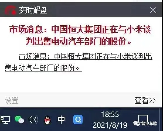 据报道,恒大集团正在与智能手机制造商小米和深圳政府支持的投资公司进行谈判,寻求出售其电动汽车部门的部分股权。根据中国恒大同日发布的公告,公司正在接触几家潜在独立第三方投资者探讨有关出售本公司旗下部分资产,包括但不限于出售本公司上市附属公司中国恒大新能源汽车集团有限公司及恒大物业集团有限公司的部分权益。