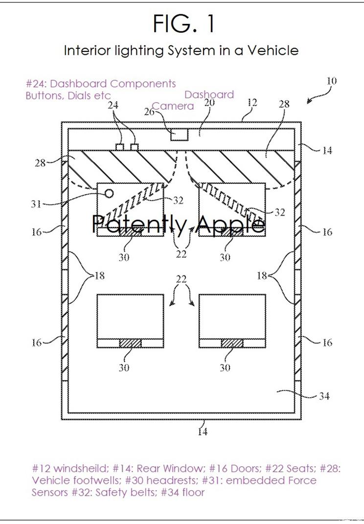 苹果专利图1展示了系统#10,包括汽车内的基本部件,如仪表盘、座椅、头枕、安全带等,还包括了一个全新的照明系统。摄像头#26可以监控车辆乘员的行动,车辆座椅#22可能配备了压力传感器#31以测量由驾驶员或者其他乘员(用户)坐在座椅上而产生的压力(重量)。