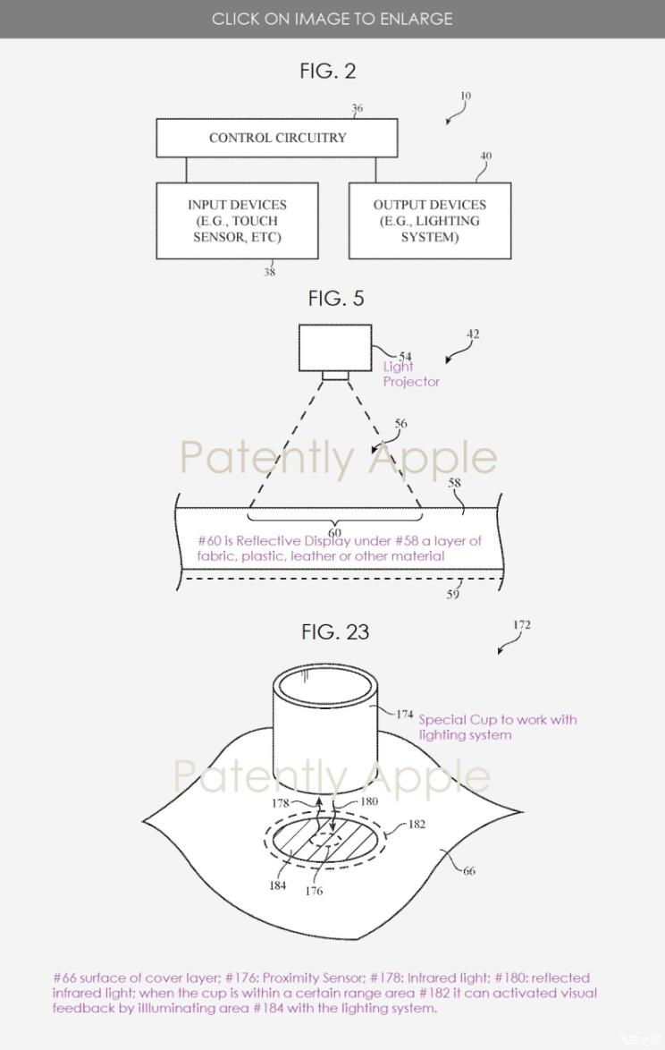 苹果专利图2是一个照明系统示意图,图5是光投影系统的侧视图,如用于提供照明的图像投影仪等。苹果专利图23是透视图,展示了一个用于放杯子和相关照明系统等物品的磁性支架。