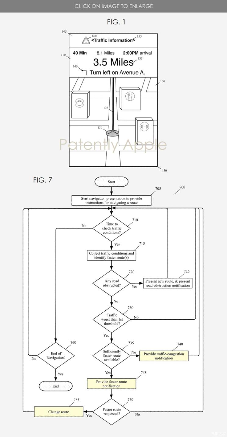 第二项泰坦项目专利名为“导航中的交通通知系统”。苹果指出,由于智能手机等移动设备的普及,用户可以在设备上运行各种各样的应用程序,其中有一种就是地图与导航应用程序,能够让用户浏览地图并获得路线方向。尽管此类应用很受欢迎,但是其功能也有缺点,给用户带来了不便。