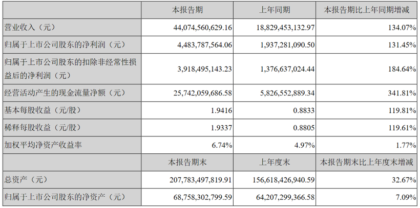 8月25日晚间,宁德时代发布2021年半年报显示,公司实现营业总收入440.75亿元,同比增长134.07%;归属股东的净利润为44.84亿元,同比增长131.45%。