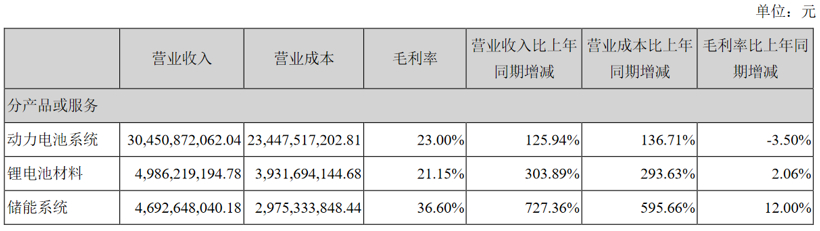 从宁德时代三个业务板块上半年的具体表现来看,其动力电池系统上半年销售收入为304.51亿元,同比增长125.94%,毛利率为23%;锂电池材料销售收入为49.86亿元,同比增长303.89%,毛利率为21.15%;储能系统销售收入46.93亿元,同比增长727.36%,毛利率为36.6%。