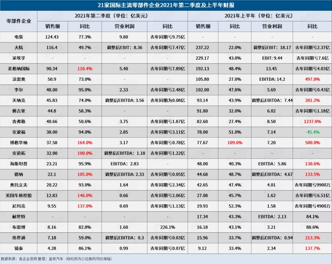 上半年,尽管汽车消费需求从疫情爆发初期的市场暴跌中强劲复苏,但全球半导体短缺又严重打击了汽车行业,迫使许多汽车制造商缩减生产计划。根据AutoForecast Solutions的数据,上半年全球范围内因芯片短缺导致的汽车产量损失在460万辆左右。鉴于去年同期零部件企业受疫情大流行的影响较为严重,业绩基数较低,因此今年二季度/上半年,几乎所有(媒体整理的21家)主流零部件企业的销售额相较去年同期均实现了两位数及以上的涨幅,营业利润也均较上年同期大幅改善。