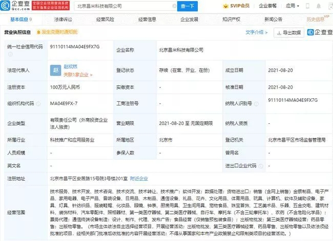 8月20日,北京昌米科技有限公司成立,该公司由小米通讯技术有限公司100%控股。法定代表人为赵欣然,注册资本100万元人民币,经营范围包含:出版物批发;第三类医疗器械经营;药品零售;销售(含网上销售)汽车零配件、自行车、摩托车(不含三轮摩托车)等。