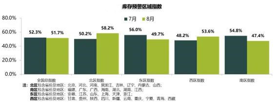 从区域指数情况看:调查显示,8月全国总指数为51.7%,北区指数为58.2%,东区指数为49.7%,西区指数为53.6%,南区指数为47.4%。受暴雨及疫情影响部分省份销量下滑明显,库存有所上升。
