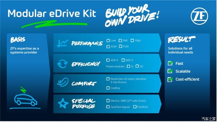 采埃孚的模块化电驱动组件还能让制造商在设计时在性能最大化和效率最大化之间灵活选择,这是因为它拥有最广的应用范围——从紧凑车型到中大型车:参数上从75到400千瓦的动力和350至540牛·米的扭矩都可以兼容。