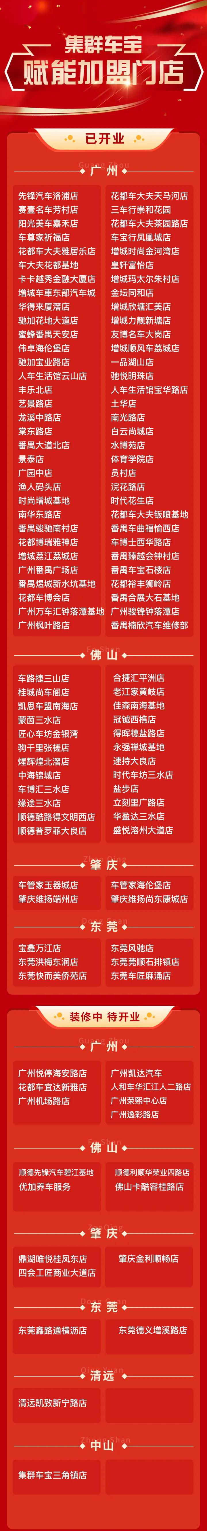 此次签约4家门店大部分处于粤港澳大湾区的核心城市,体现了集群车宝立足华南,辐射全国的战略方针。依托大湾区汽车制造基地、世界贸易中心、海陆空物流中心等区位优势,打造国内首个汽车后市场产业互联网赋能平台,建立完善的“信息化、智能化、标准化、数字化”连锁维修产业链和服务体系。