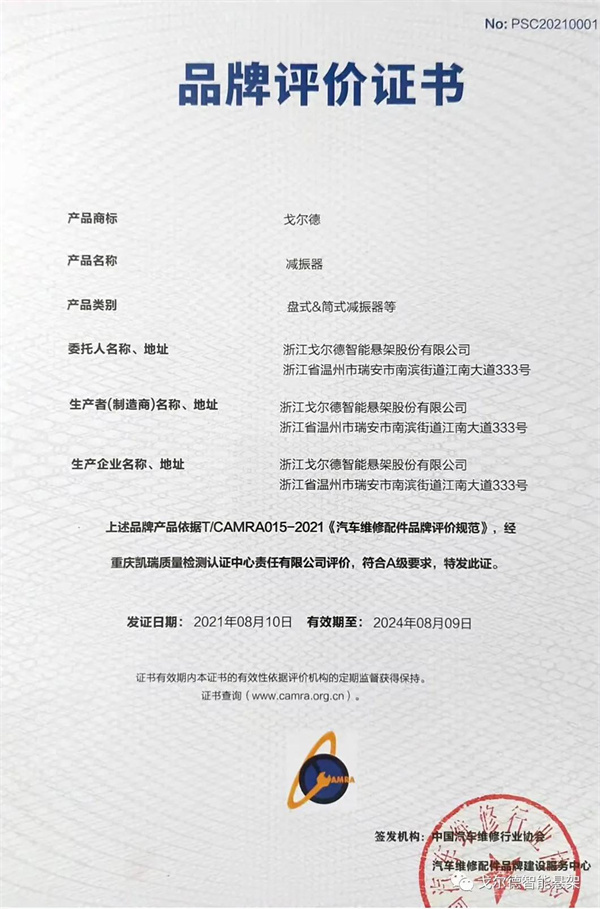 我司“戈尔德”品牌减振器产品依据T/CAMRA015-2021《汽车维修配件品牌评价规范》,经重庆凯瑞质量检测认证中心责任有限公司评价,符合A级要求,特发此证(证书编号:PSC20210001)。