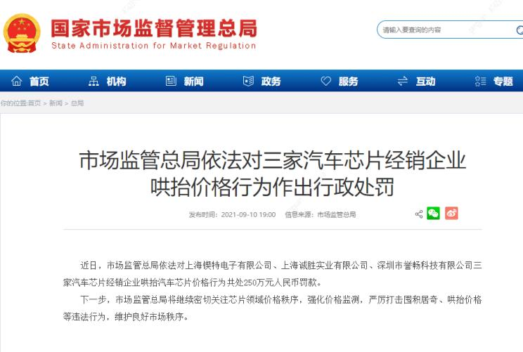近日,国家市场监管总局依法对上海锲特电子有限公司、上海诚胜实业有限公司、深圳市誉畅科技有限公司三家汽车芯片经销企业哄抬汽车芯片价格行为共处250万元人民币罚款。市场监管总局相关负责人接受记者采访时表示,当前,我国正处在疫情冲击后经济快速恢复期,我国经济恢复还不均衡,特别是中小微企业元气尚未完全恢复,需要一个平稳有序的市场环境。