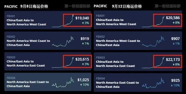 2020年8-9月,中美海运报价3000-4000美元/FEU;2021年8-9月,中美海运报价20586-22173美元/FEU;同期价格相比,因缺箱、缺船、防疫等因素,海运价格在一年间上涨了近10倍。