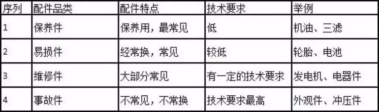 配件按照技术难度和频率来说,分为快流件(保养+易损)和慢流件(维修+事故)。具体如下: