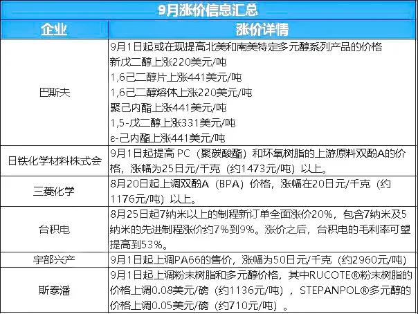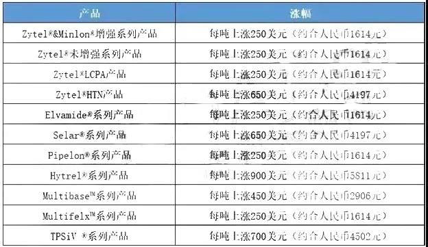 杜邦:10月1日起上调亚太地区部分产品价格,涉及产品包括长碳链尼龙、特种高温尼龙、醇溶尼龙、热塑性弹性体等多款产品,最高上涨达5800元/吨。