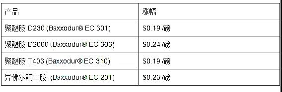 巴斯夫:10月1日起Lupranate MDI产品的价格上调0.12美元/磅(约合人民币1717元/吨);上调其聚氨酯业务的售价0.11美元/磅(约1566元/吨);在北美将二甲基氨基丙胺(DMAPA)的价格提高0.15美元/磅;提高以Baxxodur®品牌销售的部分聚醚胺在北美的价格。