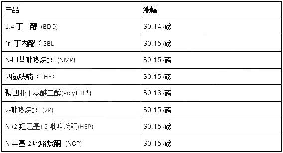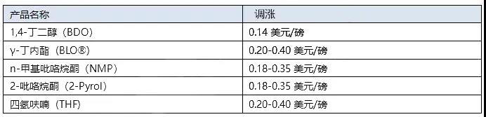 亚什兰:10月1日起,其1,4,丁二醇(BDO)及其衍生物上调0.14美元/磅-0.40美元/磅不等(约1993元/吨-5696元/吨)。