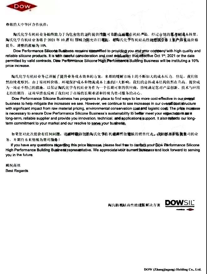 陶氏:10月1日起,对有机硅高性能建筑业务主要产品实施价格提升,调整的涨幅为10%。