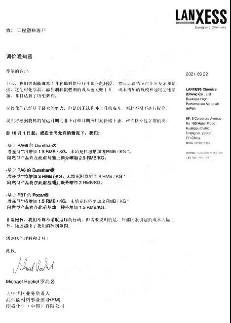 朗盛:10月1日起,对PA66、PA6、PBT等产品进行提价,最高上涨6000元/吨。