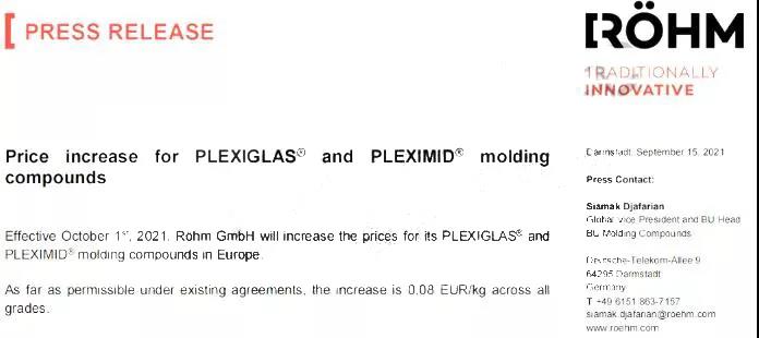 罗姆化学(原赢创):10月1日起提高其PLEXIGLAS®和PLEXIMID®PMMA(聚甲基甲酯丙烯酸树脂)的售价0.08欧元/千克(约606.5元/吨)。