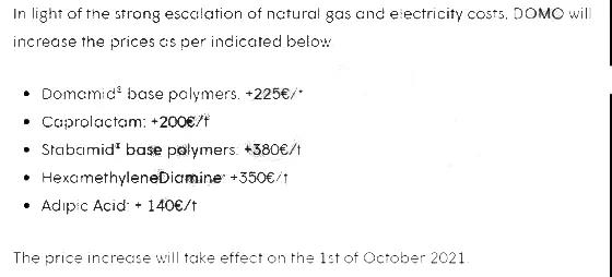 亨斯迈:将对在欧洲、非洲、中东和印度的所有MDI销售征收每吨125欧元的天然气附加费,以应对该地区不幸且史无前例的天然气价格上涨。附加费将于2021年10月1日生效,并且是先前宣布的MDI价格上涨的补充。