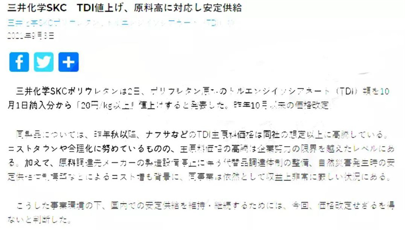 三井化学SKC:聚甲苯二异氰酸酯(TDI)将从10月1日起提高20日元/千克(约1175元/吨)以上的价格。