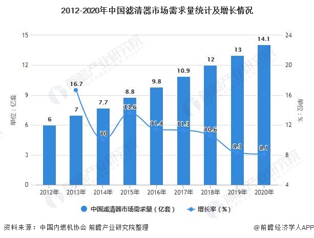 根据中国内燃机协会滤清器分会的相关数据和经验公式(滤清器∶汽车保有量=5∶1),即每辆汽车每年更换2个机油滤、1个空气滤、1个汽油滤和1个空调滤,经测算得出2012-2020年,我国由于汽车保有量的不断增长,滤清器的需求量也呈现出阶梯式逐年增长。2020年,我国滤清器的需求量约为14.1亿套,同比增长8.1%。