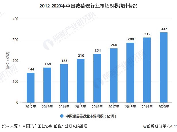 从我国汽车滤清器的市场规模来看,根据中国汽车工业协会测算标准,按照5个滤清器共计120元的消费金额来计算,2012-2020年我国滤清器市场规模增长迅速,2020年我国滤清器市场规模约为337亿元,比2012年高出193亿元。
