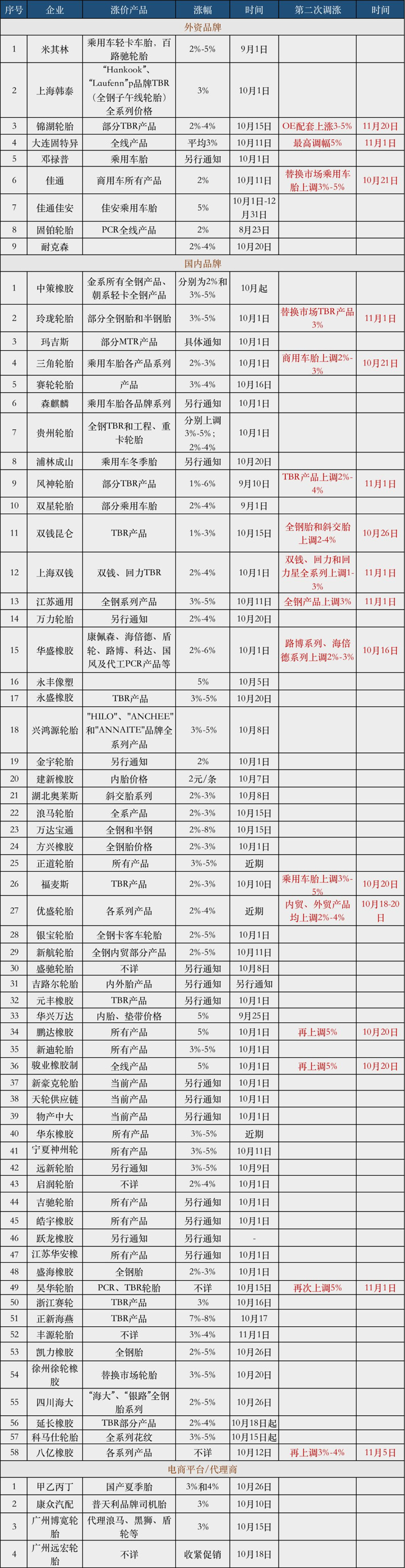 下图所示,据不完全统计,目前国内几乎所有汽车轮胎制造商包括外资品牌和自主品牌,均发布了涨价通知,最高调幅达到8%。其中,16家轮胎表示在原来基础上继续上调价格,执行时间到了11月,风神、昊华轮胎、八亿昨日刚刚发布了二次涨价通知。