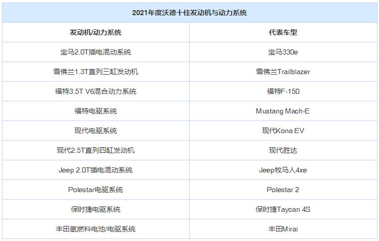 日前,随着2021年度评选工作的结束,沃德十佳发动机与动力系统获奖名单揭晓。今年的十佳名单包含2款汽油发动机、1款油电混动系统、2款插电混动系统,4款纯电驱动系统,1款氢燃料电池驱动系统,详见下表。