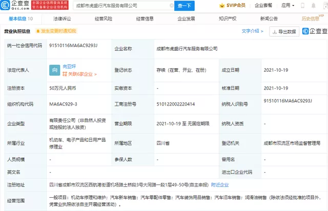 10月19日,上海阑途信息技术有限公司(以下简称:途虎养车)新增对外投资,投资企业为成都市虎盛行汽车服务有限公司(以下简称:虎盛行),投资比例100%。虎盛行成立于2021年10月19日,注册资本50万元,法定代表人为向亚坪,经营范围包括机动车修理和维护;汽车新车销售;汽车零配件零售等。该公司由途虎养车全资控股。途虎养车成立于2014年6月26日,注册资本60亿元,法定代表人为胡晓东,经营范围包括食品经营;出版物零售;货物进出口等。该公司由上海息壤信息技术有限公司全资控股,后者由TUHU Car(Hong Kong)Limited全资控股。途虎养车有103家对外投资企业,包括上海紫途电子商务有限公司、途虎(湖北)融资租赁有限公司、成都途虎信息技术有限公司等。
