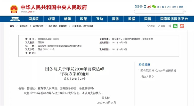 国务院印发2030年前碳达峰行动方案。方案提出,到2025年,非化石能源消费比重达到20%左右,单位国内生产总值能源消耗比2020年下降13.5%,单位国内生产总值二氧化碳排放比2020年下降18%,为实现碳达峰奠定坚实基础。到2030年,非化石能源消费比重达到25%左右,单位国内生产总值二氧化碳排放比2005年下降65%以上,顺利实现2030年前碳达峰目标。