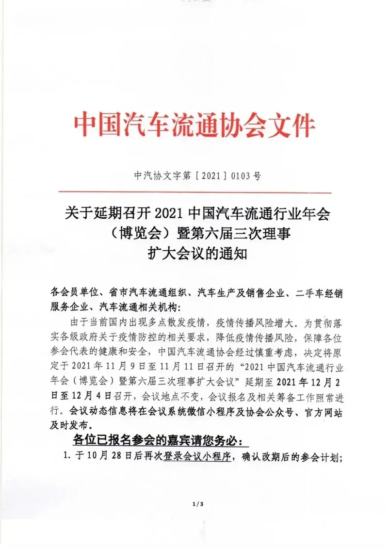 各会员单位、省市汽车流通组织、汽车生产及销售企业、二手车经销服务企业、汽车流通相关机构:由于当前国内出现多点散发疫情,疫情传播风险增大。为贯彻落实各级政府关于疫情防控的相关要求,降低疫情传播风险,保障各位参会代表的健康和安全,中国汽车流通协会经过慎重考虑,决定将原定于2021年11月9日至11月11日召开的“2021中国汽车流通行业年会(博览会)暨第六届三次理事扩大会议”延期至2021年12月2日至12月4日召开,会议地点不变,会议报名及相关筹备工作照常进行。会议动态信息将在会议系统微信小程序及协会公众号、官方网站及时发布。