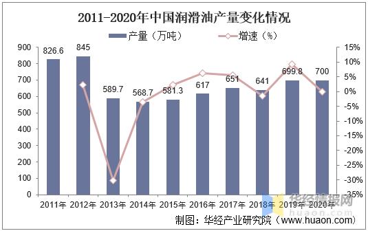 2013年以来我国国内润滑油产量下降态势明显,2011-2012年间国内润滑油产量一度达到856.94万吨的历史高点,2013年以来国内润滑油产量震荡下行,2020年受公共安全事件影响,第一季度润滑油工厂开工率不高,但随着疫情的控制,在第三、四季度,润滑油工厂的产量都同比2019年同期有所增加,使得2020年我国润滑油产量同比上升,为700万吨。