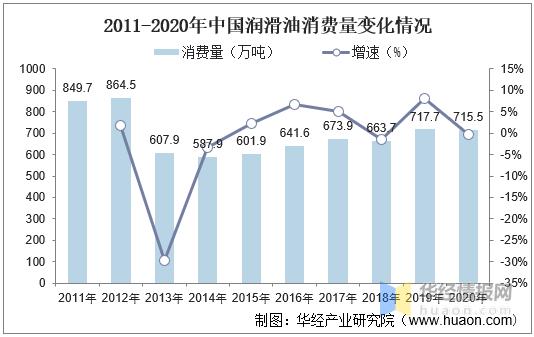润滑油使用水平的高低,直接反映了这个国家经济发展程度和设备控制状况及生产效率和环保意识的差异。随着我国经济的高速增长,2013年以前我国润滑油消费量持续上升,到2012年达到峰值,2013年出现大幅度下降。2013-2020年开始震荡回升,到2020年中国润滑油消费量上升至715.5万吨。