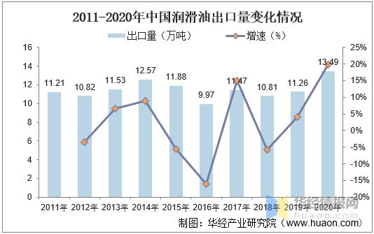 根据数据显示,2011-2020年中国润滑油出口量呈现震荡上升的趋势,其中出口量最低的为2016年,出口量为9.97万吨。到2020年中国润滑油出口量上升至13.49万吨,同比上升19.8%。2020年出口量的大幅上升,受到新冠疫情的影响较大。